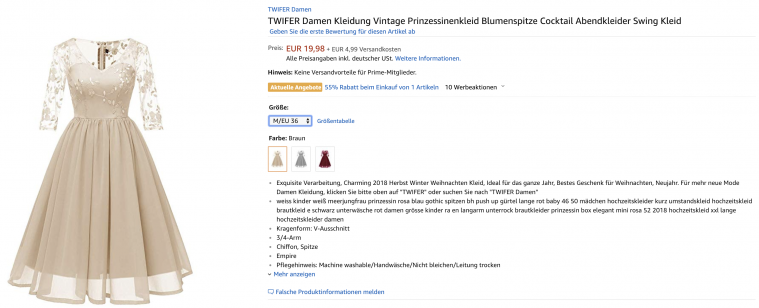 Auf der Einzelproduktseite führt Amazon in seinem Onlineshop alle erdenklichen wesentlichen Produktmerkmale auf, so dass sich der potentielle Käufer hier ausführlich über die zu erwartenden Produkteigenschaften informieren kann. Bei anderen Produkten mag es nicht so einfach sein, "alle" wesentlichen Merkmale des Produktes zu benennen. Bei einem Kleid hingegen sind die wesentlichen Merkmale einfach zu bestimmen: Größe, Farbe, Material, Gewicht, Preis, damit sollten alle wesentlichen Eigenschaften abgedeckt sein.