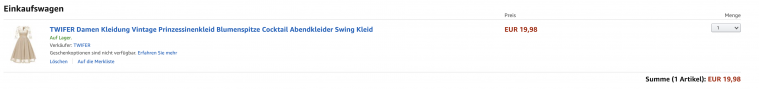 Auf der Warenkorbseite übernimmt Amazon nur noch den Titel des gewählten Produktes und informiert darüber, ob das Produkt vorrätig ist, was es kostet und wer der Verkäufer ist. Weitere wesentliche Produktmerkmale wie Größe und Farbe etc. führt Amazon im Warenkorb nicht auf.