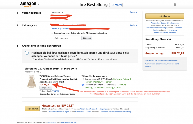 Anhand eines konkreten Beispiels, dass sich an der Klage anlehnt, welche den juristischen Stein ins Rollen gebracht hat, möchten wir verdeutlichen, wie der Check-Out Prozess bei Amazon & Co. bisher aussieht und was sowohl das Land- wie auch das Oberlandesgericht München daran auszusetzen haben.