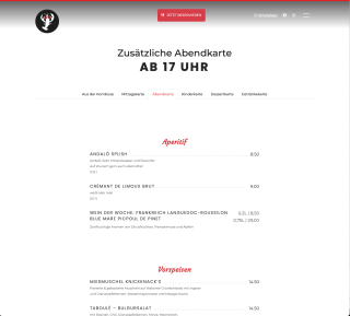 Das Reservierungstool, welches wir bereits individuell für den Kunden programmiert und auf der Website im Einsatz hatten, wurde gleichzeitig funktionell erweitert wie vom Layout her vereinfacht, um es den Gästen noch einfacher zu machen, einen Tisch zu reservieren. Auch die Speise- und Getränkekarten präsentieren sich jetzt so edel wie in der physischen Realität im Restaurant. Wir haben besonderen Wert auf hochwertige Bilder und eine ansprechende Präsentation gelegt, um den Gästen bereits vor ihrem Besuch einen Einblick in das kulinarische Angebot zu geben.