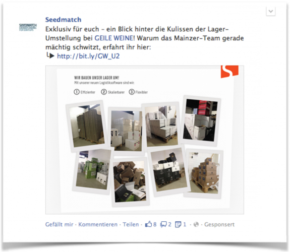 Bei Facebook kann man z.B. „Page Post Ads“ schalten, die Nutzern von Facebook dann in deren Timeline (mobile und auf dem Desktop) als „gesponsorter“ Post angezeigt wird - siehe Bild oben.Im Beispiel auf dem Bild oben führt der Link im gesponserten Post auf die externe Seite von seedmatch.de.