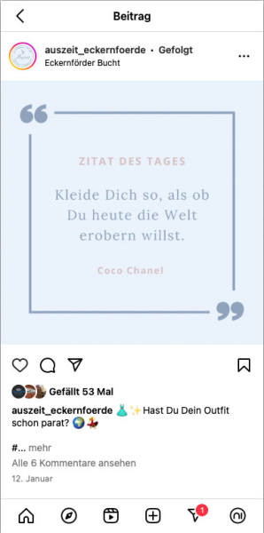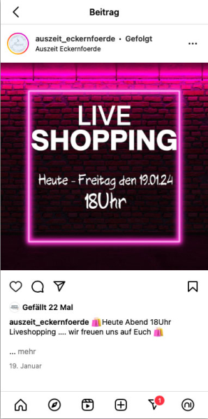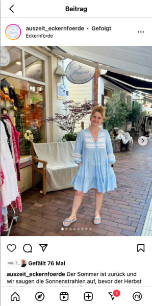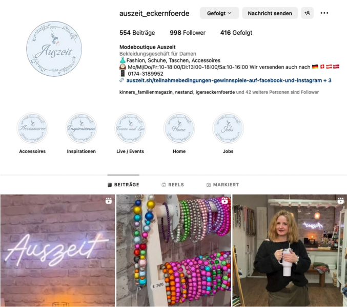 Die Modeboutique Auszeit, geführt von Nicole und Nico Krambeck, ist ein charmantes Geschäft in der malerischen Altstadt von Eckernförde. Bereits 2021 buchten die Beiden Online-Schulungen für den Bereich Social Media bei uns. Der Aufwand überstieg jedoch schnell die zeitlichen Kapazitäten, um diesen Werbezweig in die eigene Hand zu nehmen, so legten sie die Betreuung ihrer Netzwerke kurz darauf in unsere Hände.